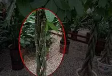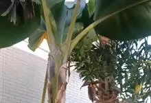香蕉’),芭蕉科芭蕉属多年生草本植物,植株丛生,有匐匍茎;假茎浓绿有黑色斑点;叶片长圆形,上面为深绿色,无白粉,下面浅绿色;花朵为乳白色或淡紫色;果实呈弯曲的弓状,有棱,果皮为青绿色,…全部>>