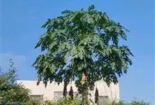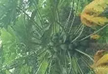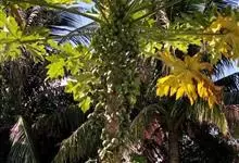 番木瓜,番木瓜科番木瓜属的常绿软木质小乔木,高达10米,具有乳汁;茎不分枝或有时于损伤处分枝;叶大且聚生于茎顶,近似盾形,叶柄中空;花单性或两性,有些品种雄株偶尔生两性花或雌花,…全部>>