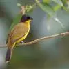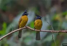 黑冠黄鹎:体长18-21厘米,是一种中等体型偏黄色鹎。整个头、颈、颏、喉黑色,头顶有显著直立的羽冠,黑色,上体褐橄榄黄绿色,下体橄榄黄色。虹膜偏红;嘴及脚黑色。…全部>>