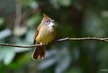 白喉冠鹎:体长20-25厘米。头顶红褐色,有长而细的羽冠、红褐色,头侧灰色。上体橄榄绿黄色,飞羽暗褐色,外翈茶黄色,尾下覆羽皮黄色。…全部>>