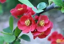 贴梗海棠 Nakai)是蔷薇科、木瓜海棠属植物。落叶灌木,高达2米,枝条直立开展,有刺。叶片卵形至椭圆形,稀长椭圆形,长3-9厘米,宽1.5-5厘米。花先叶开放,3-5朵簇生于二年生老枝上。…全部>>