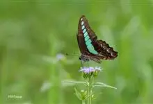 青带凤蝶Graphium sarpedon ,又名青凤蝶,是最普遍的中型凤蝶,飞行速度很快。青带凤蝶的翅膀中央有许多浅蓝色的斑点,很整齐地排列成一条直线。这些斑点由上而下逐渐变大,就像一条青色的带子。全部>>