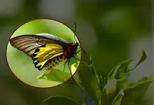荧光裳凤蝶是凤蝶科裳凤蝶属的一种大型蝴蝶,该物种共有3个亚种。该蝶飞翔的时候姿态优美,前翅黑色,后翅金黄色和黑色交融的斑纹在阳光照射下金光灿灿,显得华贵美丽。幼虫寄主为多种马兜铃属的植物,取食马兜铃…全部>>