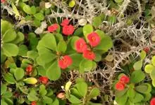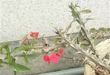虎刺梅:别称铁海棠,是蔓生灌木植物。茎多分枝,长60-100厘米,直径5-10毫米,具纵棱,密生硬而尖的锥状刺,刺长1-1.5厘米,直径0.5-1.0 毫米,常呈3-5列排列于棱脊上,呈旋转。叶互生…全部>>