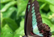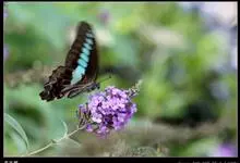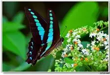 青带凤蝶Graphium sarpedon ,又名青凤蝶,是最普遍的中型凤蝶,飞行速度很快。青带凤蝶的翅膀中央有许多浅蓝色的斑点,很整齐地排列成一条直线。这些斑点由上而下逐渐变大,就像一条青色的带子。全部>>