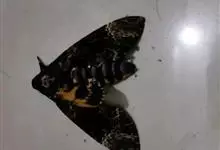 鬼脸天蛾,是鳞翅目天蛾科面形天蛾属动物。成虫翅展100~125毫米,体黑褐色;胸背有骷髅形斑纹;卵圆球形,直径约2毫米,淡黄绿色,表面光滑;老熟幼虫体长70~90毫米,蛹体长约56毫米;前翅为褐色,…全部>>