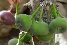 大果榕是桑科榕属的小乔木,株高可达10米;幼枝被柔毛;叶互生,宽卵状心形或近圆形;雄花无梗、匙形、花丝长,雌花生于雌株榕果内,子房白色;榕果簇生于树干基部或老茎短枝上、扁球形或陀螺形,…全部>>