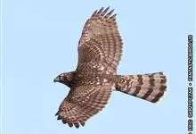 褐耳鹰的体形比苍鹰要小得多,为小型猛禽,体长为31-44厘米,体重217-325克。上体灰色,下体具赤褐色横斑。第6枚初级飞羽外羽片无缺刻,次外侧的4对尾羽具5道黑褐色横斑。眼先具白色短羽。…全部>>