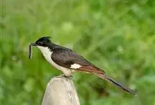 斑翅凤头鹃: 成鸟具羽冠,上体及头侧、翅、尾等黑色,具铁绿色亮辉,尾羽端部具白斑,两侧者形宽,中央者较狭;下体白色、淡灰白或略带棕黄色。虹膜褐至红褐色;嘴黑色;脚灰蓝黑色。…全部>>