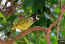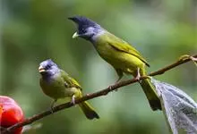 凤头雀嘴鹎:属小型鸟类,体长18-22厘米。嘴粗短、呈象牙色或乳黄色,前额和脸灰色,头顶黑色,有一朝前竖立的黑色羽冠。上体橄榄绿色,下体黄绿色,尾羽黄绿色具宽阔的黑褐色端斑。…全部>>