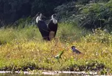 黑水鸡:是鹤形目、秧鸡科的鸟类,共有12个亚种。中型涉禽,体长24-35厘米。嘴长度适中,鼻孔狭长;头具额甲,后缘圆钝;嘴和额甲色彩鲜艳。翅圆形,第2枚初级飞羽最长,或第2枚和第3枚初级飞羽等长,…全部>>
