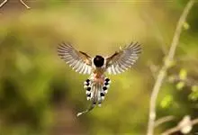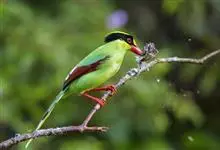 蓝绿鹊:中型鸟类,共有5个亚种。体长36-38厘米。尾长,嘴、脚红色。通体羽色主要为草绿色,宽阔的黑色贯眼纹向后延伸到后颈,在绿色的头侧极为醒目。两翅栗红色,内侧飞羽具黑色次端斑和白色尖端。尾绿色,…全部>>