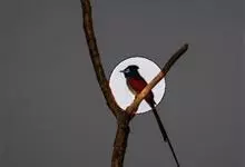 朱鹂:中等鸟类,体长23-28厘米。雄鸟绛紫红色,头、上胸及翼黑色。雌鸟上背及背部深灰色,尾覆羽及尾绛紫红色,腹部及下胸白而密布黑色纵纹。与鹊色鹂幼鸟的区别在上背灰色较深,下体白色较少且纵纹较粗。…全部>>