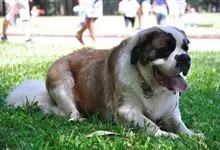 圣伯纳犬,别名巴里汉德,属于大型工作犬,肩高约65~90厘米,体重约50~90千克。圣伯纳犬身体强壮,被毛红褐色和白色相间,头圆而宽大。颈部强壮,胸宽深,背直。前肢长直,腕关节略前倾,后肢腿骨粗壮,…全部>>