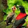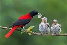 朱鹂:中等鸟类,体长23-28厘米。雄鸟绛紫红色,头、上胸及翼黑色。雌鸟上背及背部深灰色,尾覆羽及尾绛紫红色,腹部及下胸白而密布黑色纵纹。与鹊色鹂幼鸟的区别在上背灰色较深,下体白色较少且纵纹较粗。…全部>>