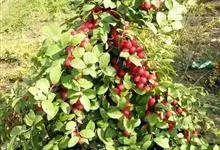 欧李,蔷薇科李属落叶灌木植物,高1.5米。树皮灰褐色,小枝被柔毛;叶互生长圆形或椭圆状披针形;花与叶同时开放,单生或并生,花瓣白色或粉红色;核果近球形,熟时鲜红色或橘黄色。花期4-5月,果期5-6月。…全部>>