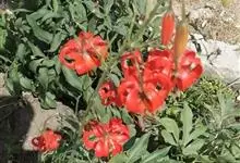山丹是百合科百合属的多年生草本植物。鳞茎卵形或圆锥形,鳞片长圆形或长卵形,白色;叶散生茎中部,线形,边缘有乳头状突起;花单生或数朵成总状花序,花鲜红色,常无斑点,花被片反卷,…全部>>