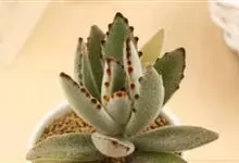 褐斑伽蓝是景天科伽蓝菜属的多年生多肉类植物,茎直立,多分枝,叶生于枝上,肉质叶片匙形,上面密被白色绒毛,下部全缘,叶缘上部有缺刻,缺刻处有深褐或棕色斑块。褐斑伽蓝原产非洲的马达加斯加岛。…全部>>
