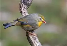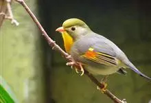 银耳相思鸟小型鸟类,体长14~18厘米。头顶黑色,耳羽银灰色,前额橙黄色;外侧飞羽橙黄色,基部朱红色,极为鲜艳、醒目。尾圆形,尾上、尾下覆羽朱红色,尾暗灰褐色,外侧尾羽橙黄色,其余上体橄榄绿或橄榄黄色。…全部>>