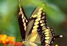 金凤蝶,是鳞翅目凤蝶科凤蝶属动物。金凤蝶为中型凤蝶,翅展70-84毫米,翅背面底色黑褐色,翅脉黑色,翅室具黄斑;前翅背面基部呈暗黄色,亚外缘为黑色,内具一列小黄斑;后翅背面亚外缘区具黑宽边,…全部>>