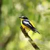 棕腹大仙鹟:体重24-28克,体长15-17厘米,是一种小型的色彩亮丽的鹟。雄鸟上体深蓝,下体棕色,脸黑,额、颈侧小块斑、翼角及腰部亮丽闪辉蓝色。与棕腹仙鹟易混淆,区别在色彩较暗。雌鸟灰褐,…全部>>