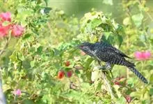 噪鹃是鹃形目杜鹃科噪鹃属鸟类,又名栽秧雀、哥好雀。雄鸟通体乌黑泛幽蓝色金属光泽,下体泛蓝绿色;虹膜血红色,啄淡土黄色,基部较暗,脚蓝灰色。雌鸟上体、翼和尾为深褐色,…全部>>