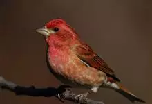 酒红朱雀小型鸟类,体长13~15厘米。雄鸟通体深红色,头部深朱红或棕红色,下背和腰玫瑰红色,眉纹粉红色而具丝绢光泽。两翅和尾黑褐或灰褐色、具暗红色狭缘,内侧两枚三级飞羽具淡粉红色先端。…全部>>