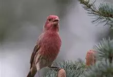 大朱雀:体重33-52克;体长167-205毫米;体形较大;为不常见留鸟。体羽深红色;羽中央具白色或带粉白色斑点,颊深红色;雌鸟体羽淡灰色,稍暗的颊具有阴暗或带褐色斑纹;下背和腰无斑纹。…全部>>