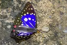 大紫蛱蝶为大型蝶种,翅展约86~110mm。翅紫黑色,有白色斑点点缀其中,雄蝶的翅具强烈紫色虹彩,其余部分暗褐色,后翅臀角具粉色斑。雌蝶体型较大,但是没有蓝紫金属光泽。原产于东亚的蝶类。…全部>>