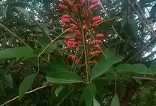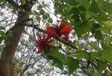 翅果刺桐 Merr.)是豆科,刺桐属乔木,高12-15米,具粗壮的刺。羽状复叶具3小叶,小叶膜质,卵状三角形,先端短渐尖,基部圆或宽楔形,两面无毛;总状花序长7-10厘米,有褐色绒毛;花红色,花萼钟状,…全部>>