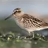 阔嘴鹬是涉禽,体长17厘米。特征为翼角常具明显的黑色块斑并具双眉纹。与黑腹滨鹬平滑下弯的嘴相比,阔嘴鹬的嘴具微小纽结,使其看似破裂。上体具灰褐色纵纹;下体白,胸具细纹;腰及尾的中心部位黑而两侧白。…全部>>