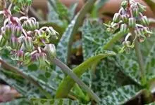 油点百合属于百合科的多年生草本植物,别称是豹纹红宝。原产于南非。株高约10-15公分,紫红色的茎肥大呈酒瓶状,茎顶着生3-5片肉质叶子,叶银绿色并具有不规则的斑点,叶背紫红色。花期春夏季,圆锥花序,…全部>>