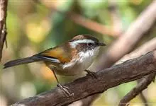 棕头雀鹛为鸦雀科,褐鹛属小型鸟类,体长10-13厘米。头顶栗褐色具黑色侧冠纹。上体茶黄色,飞羽外侧表面灰白色,内侧表面红棕色,内外二色之间夹有黑色。颏、喉白色具不明显的暗色纵纹,胸沾葡萄灰色,…全部>>