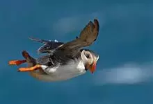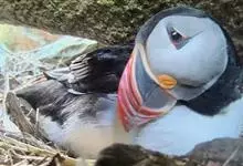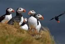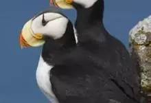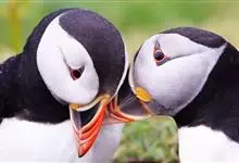 角海鹦:是鸻形目海雀科的鸟类,体重581-648克,体长约32厘米,翼展18-20厘米。是一种身体结实的鸟类,蹼脚、翅膀短,擅长游泳捕鱼,而在陆地上行走时则显得僵硬、步履蹒跚。有一张大嘴巴,呈三角形…全部>>