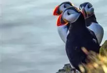 角海鹦:是鸻形目海雀科的鸟类,体重581-648克,体长约32厘米,翼展18-20厘米。是一种身体结实的鸟类,蹼脚、翅膀短,擅长游泳捕鱼,而在陆地上行走时则显得僵硬、步履蹒跚。有一张大嘴巴,呈三角形…全部>>