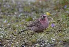 藏朱雀:全长约17-18厘米。雄鸟头部深红色具光辉,喉部暗红色具白色点斑;背部灰白色,各羽具玫瑰红色羽端,形成许多斑纹;腰部淡玫瑰红色;翅暗褐色,沾灰白,羽端沾玫瑰红或灰白色;尾暗棕色,端缘玫瑰红色…全部>>