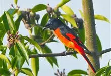 灰喉山椒鸟:共有8个亚种。体长18-22厘米。雄鸟头部和背亮黑色,腰、尾上覆羽和下体朱红色,翅黑色具一大一小的两道朱红色翼斑。中央尾羽黑色,外侧尾羽基部黑色,端部红色。…全部>>