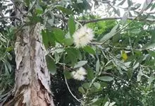 白千层 Barlow)是桃金娘科白千层属的乔木;树皮灰白色,厚而松软,呈薄层状剥落;嫩枝灰白色;叶互生,叶片革质,披针形或狭长圆形,两端尖多油腺点,香气浓郁;叶柄极短;花白色,密集于枝顶成穗状花序,…全部>>