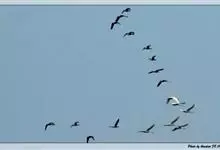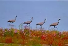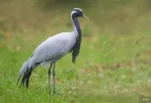 蓑羽鹤大型涉禽,体长68~92厘米,是鹤类中个体最小者。通体蓝灰色,眼先、头侧、喉和前颈黑色,眼后有一白色耳簇羽极为醒目。前颈黑色羽延长,悬垂于胸部。脚黑色,飞翔时翅尖黑色。…全部>>