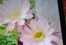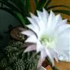 仙人球花 仙人掌科,仙人球属。植株单生或成丛。幼株球形,老株长成圆筒状,高可达75厘米,直径12-15厘米。球体暗绿色,具棱11-12。刺锥状,黑色,长1-1.5厘米。花着生于球体侧方,大型嗽喇叭状…全部>>