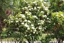 石楠 Kalkman),是蔷薇科石楠属的常绿乔木,高5~12米,株型紧凑,树冠圆球形。树枝为褐灰色;鳞片为褐色,没有毛;叶片革质,长椭圆至侧卵状椭圆形,有锯齿,新叶红色光亮。复伞房花序,白色小花,…全部>>