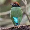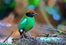 绿胸八色鸫:是雀形目八色鸫科的鸟类,共有12个亚种。体长为16-18厘米,体重65-69克。体型圆胖,尾短,腿长。头黑,上体绿色,两翼深色而具白色斑纹,头顶至后枕深褐,胸及腹部苹果绿,臀亮红。…全部>>