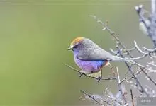 花彩雀莺:体长9-12厘米,是一种毛茸茸偏紫色的雀莺。顶冠棕色,眉纹白。尾长,羽毛松软。前额有一宽阔的眉纹淡黄色,头顶栗色或棕红色,有的具紫蓝色光泽。背灰色,腰和尾上覆羽辉紫蓝色,飞羽灰褐色。…全部>>