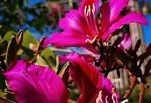 红花羊蹄甲,为豆科羊蹄甲属植物,别名艳紫荆、洋紫荆。半落叶乔木,高达了~10 m,叶草质,近圆形或阔心形,长8~13cm顶端开裂至全叶长1/4~13,裂片顶端圆。总状花序顶生或腋生,花冠紫红色,…全部>>