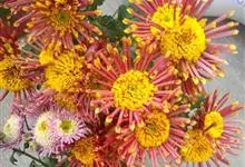 菊花是菊科菊属多年生草本植物。原产于中国,被视为日本的国花。由某些野生菊经种间杂交演化而来的;茎多分枝,基部木质化;单叶互生,多卵圆形,边缘具粗大锯齿或深裂;头状花序,外围为舌状花,大小、形状变化很大,…全部>>