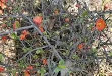 贴梗海棠 Nakai)是蔷薇科、木瓜海棠属植物。落叶灌木,高达2米,枝条直立开展,有刺。叶片卵形至椭圆形,稀长椭圆形,长3-9厘米,宽1.5-5厘米。花先叶开放,3-5朵簇生于二年生老枝上。…全部>>