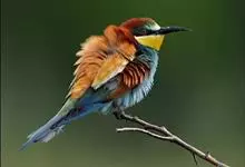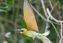 蓝颊蜂虎:是蜂虎科、蜂虎属的鸟类,共有2个亚种。体长27-33厘米,翼展46-49厘米,体重38-50克。嘴形细长而下弯,先端尖,…全部>>