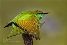 绿喉蜂虎是佛法僧目、蜂虎科的小型鸟类,共有9个亚种。身长22-25厘米,翼展29-30厘米,体重15-20克。喉绿色,额部、头顶至上背为锈红色,其余上体均为亮绿色。中央尾羽延长且端段狭细,…全部>>