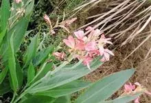 粉美人蕉:是一种球根草本植物。根茎延长,株高1.5-2米;茎绿色。叶片披针形;总状花序疏花,单生或分叉,稍高出叶上;苞片圆形,褐色,花黄色,无斑点;有多种园艺栽培品种,颜色从粉、橙红色及具带红色斑点…全部>>