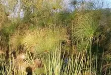 纸莎草是莎草科、莎草属的植物,具有粗壮的根状茎,高达2-3米,茎秆簇生,粗壮,直立,钝三棱形。叶退化呈鞘状,茎秆顶端着生总苞片,呈伞状簇生,总苞片叶状,披针形,顶生花序伞梗极多,细长下垂。瘦果灰褐色,…全部>>
